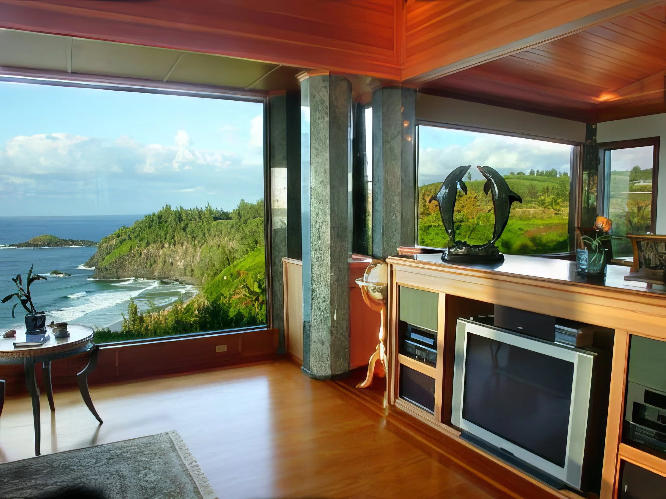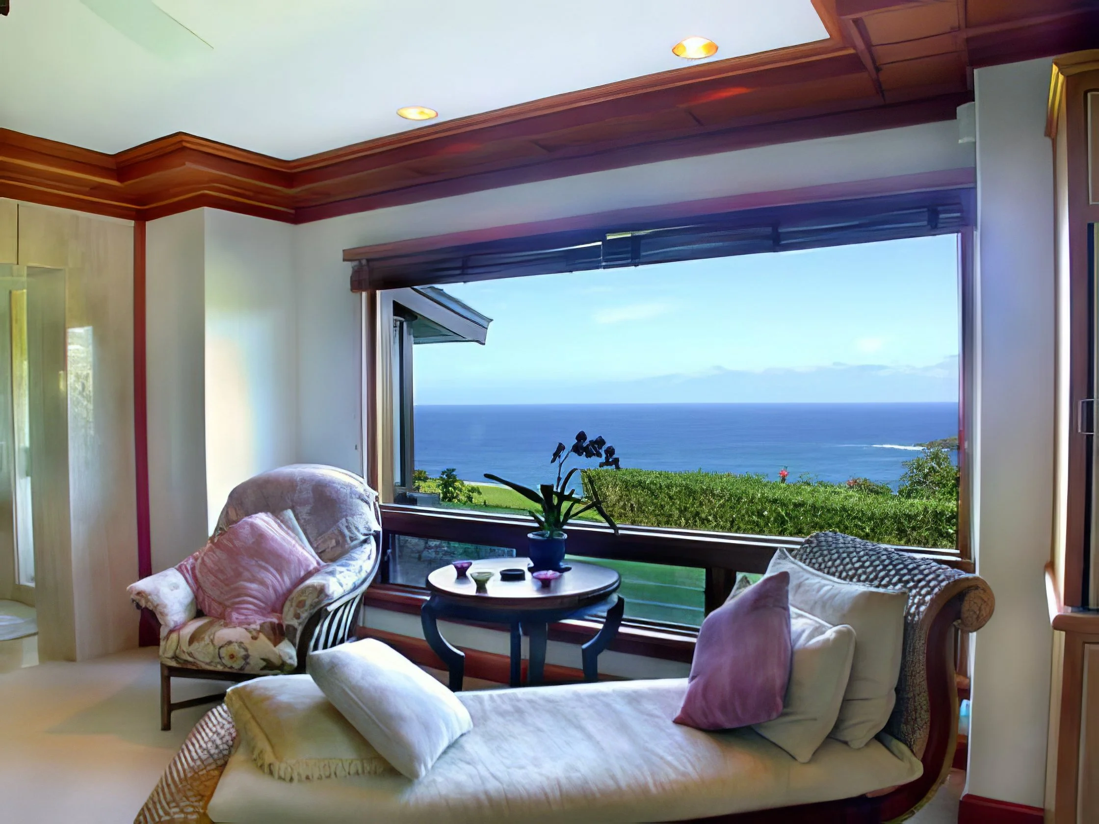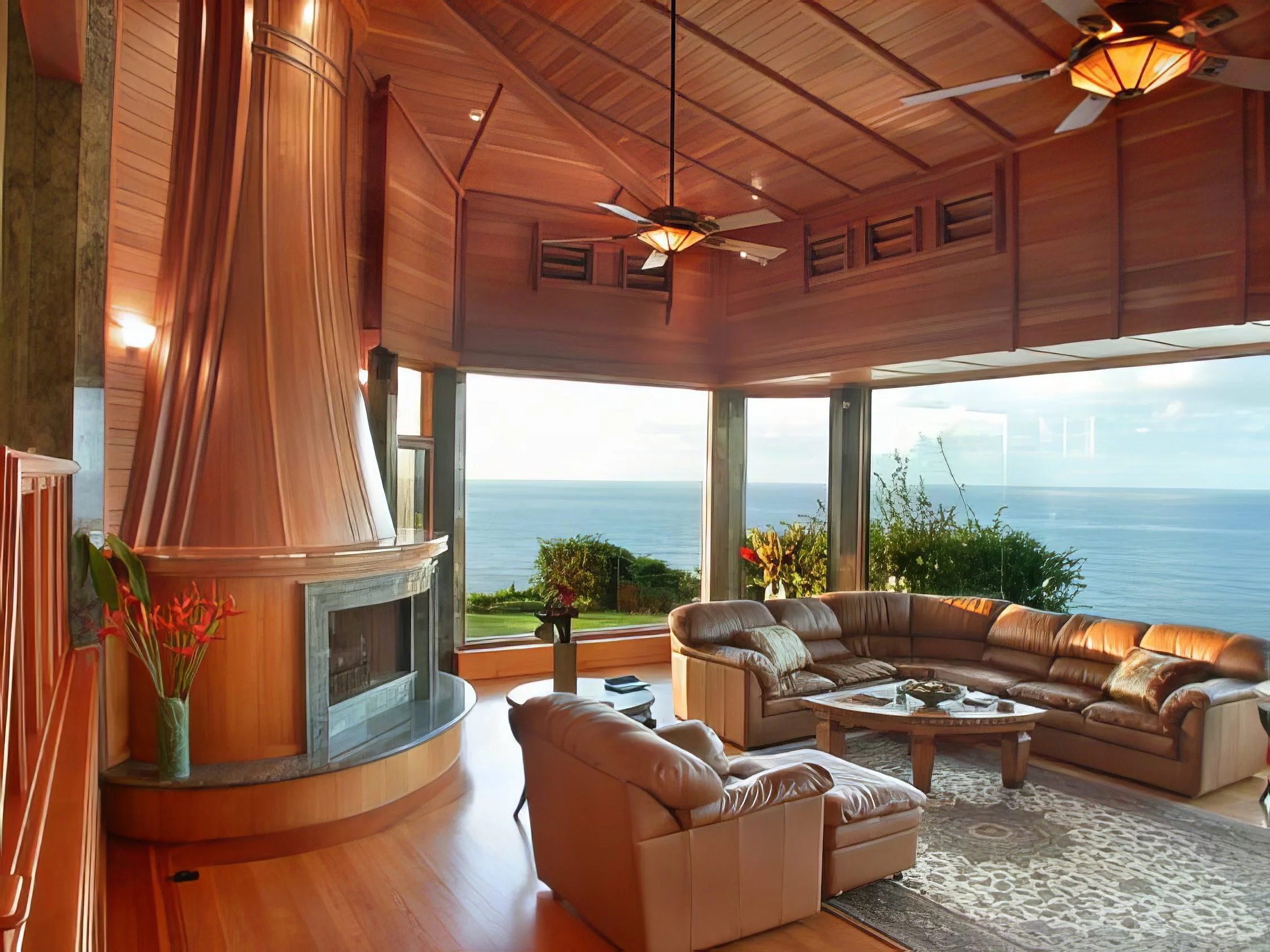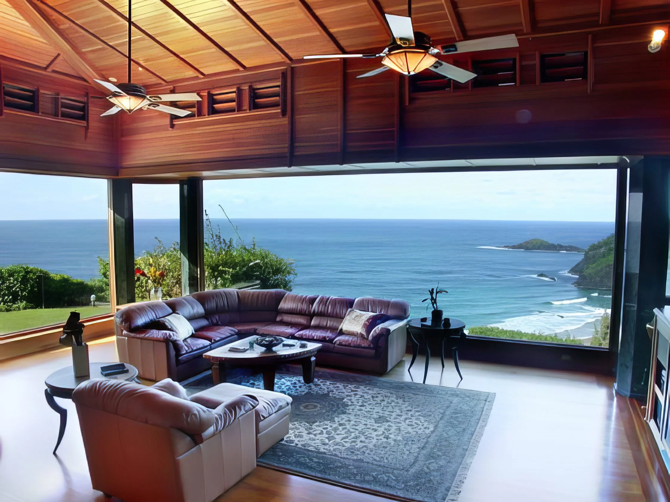 Show-Stopping Glass Wall: A dramatic floor-to-ceiling window in the main living area frames one of the most striking ocean views on the island.